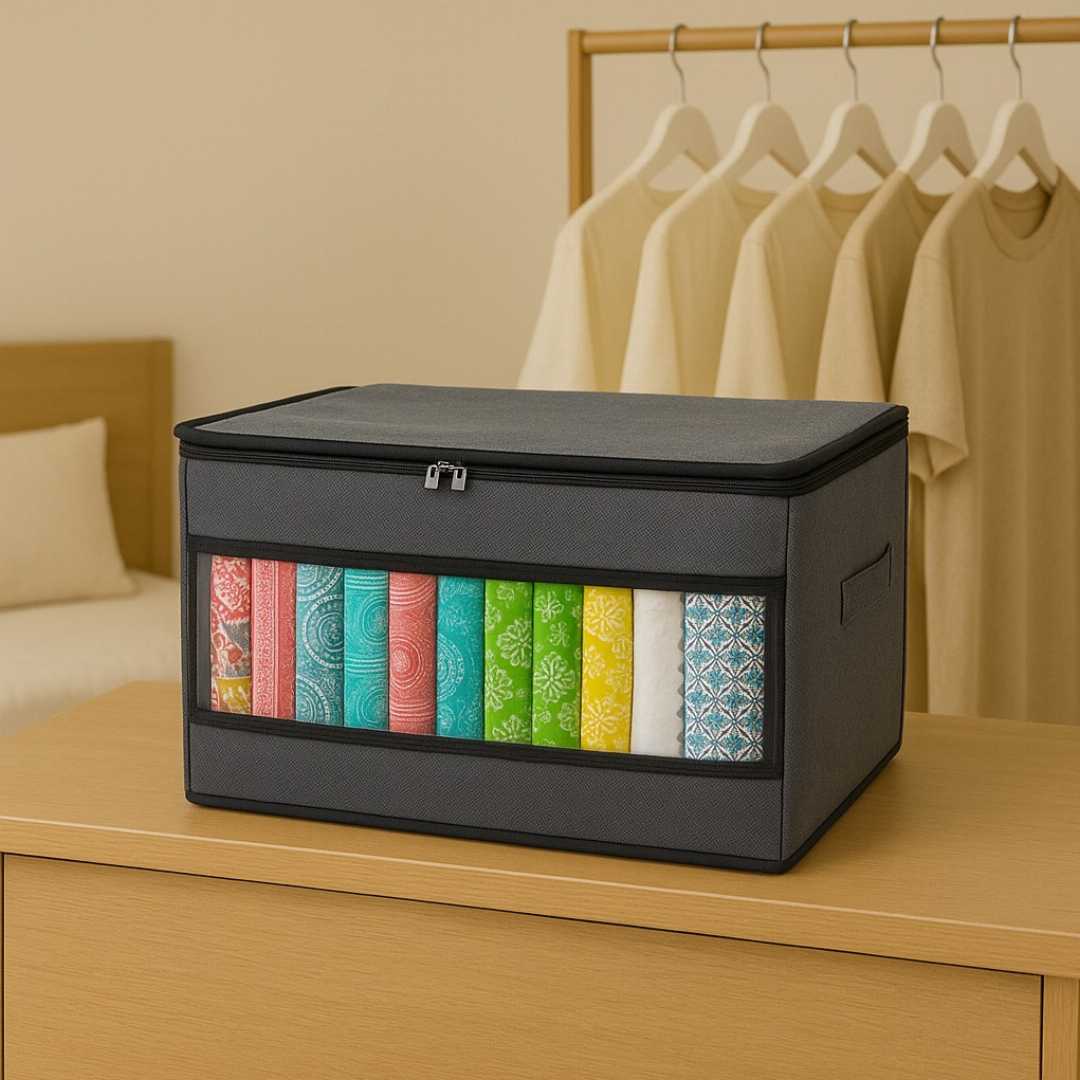 Declutter your wardrobe and organize your clothes effortlessly with our Printed Transparent Cloth Organizer Box â the perfect blend of fashion and function. Crafted with premium printed fabric and a sturdy build, this organizer not only saves space but also adds a modern touch to your storage solution.